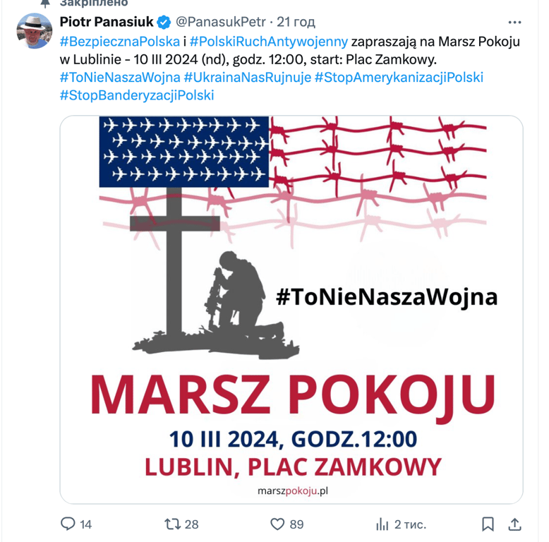 Пост Пьотра з закликом доєднуватись до маршу "Це не наша війна"