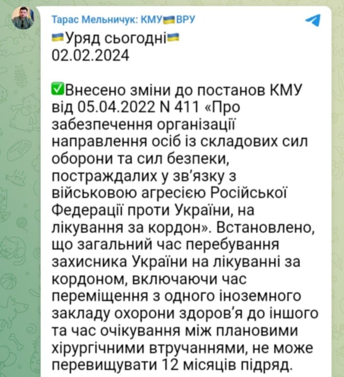 "Встановлено, що загальний час перебування захисника України на лікуванні за кордоном, включаючи час переміщення з одного іноземного закладу охорони здоровʼя до іншого та час очікування між плановими хірургічними втручаннями, не може перевищувати 12 місяців підряд", — наголосив політик.