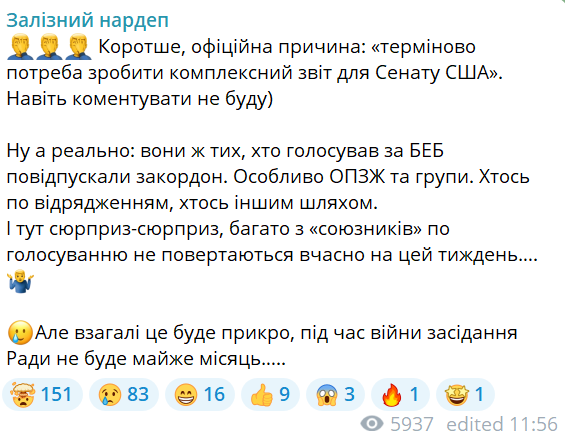 В то же время, как рассказал Железняк, официальная причина отмены заседания — "срочная необходимость сделать комплексный отчет для Сената США".