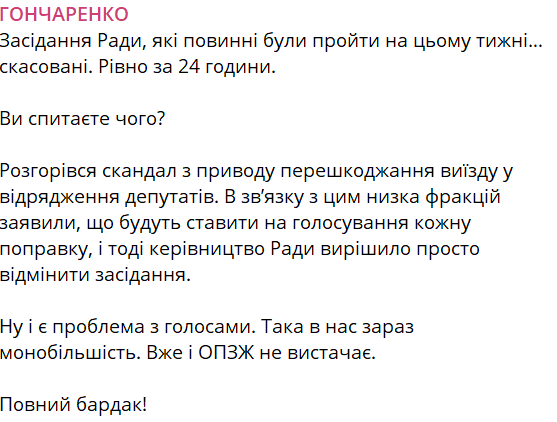 "Заседания Рады, которые должны были пройти на этой неделе... отменены. Ровно через 24 часа", — написал Гончаренко.