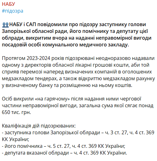 Национальное антикоррупционное бюро Украины и Специализированная антикоррупционная прокуратура сообщили о подозрении заместителю председателя Запорожского областного совета, его помощнику и депутату облсовета, задержанным вчера на предоставлении неправомерной выгоды работнику коммунального медучреждения.