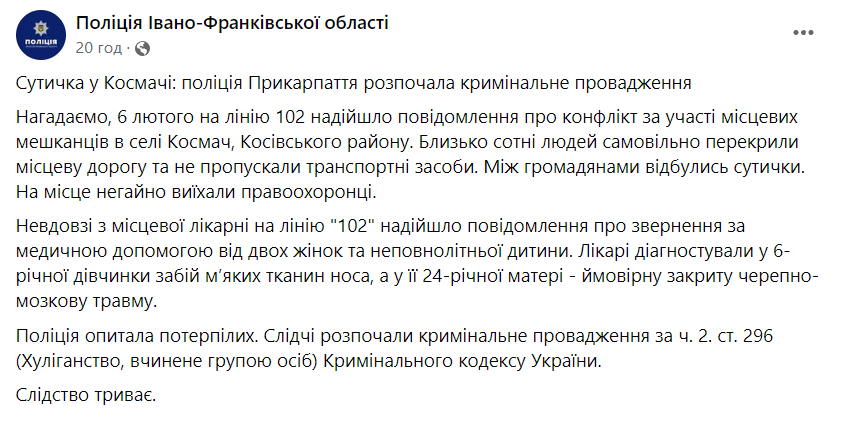 За данными полиции, после стычки в Космаче за медицинской помощью обратились две женщины и ребенок. У 6-летней девочки диагностировали ушиб мягких тканей носа, а у ее 24-летней матери вероятна закрытая черепно-мозговая травма.
