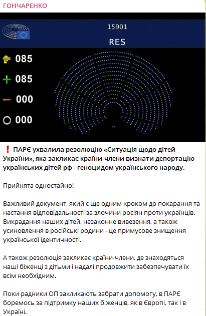 Парламентская ассамблея Совета Европы единогласно приняла резолюцию, связанную с ситуацией детей из Украины. Документ, названный "Ситуация с детьми Украины", призывает государства-члены признать вывоз украинских детей в Россию как акт геноцида украинского народа.
