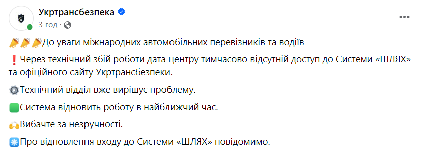 "Из-за технического сбоя работы дата центра временно отсутствует доступ к Системе "ШЛЯХ" и официальному сайту Укртрансбезопасности", — говорится в сообщении.